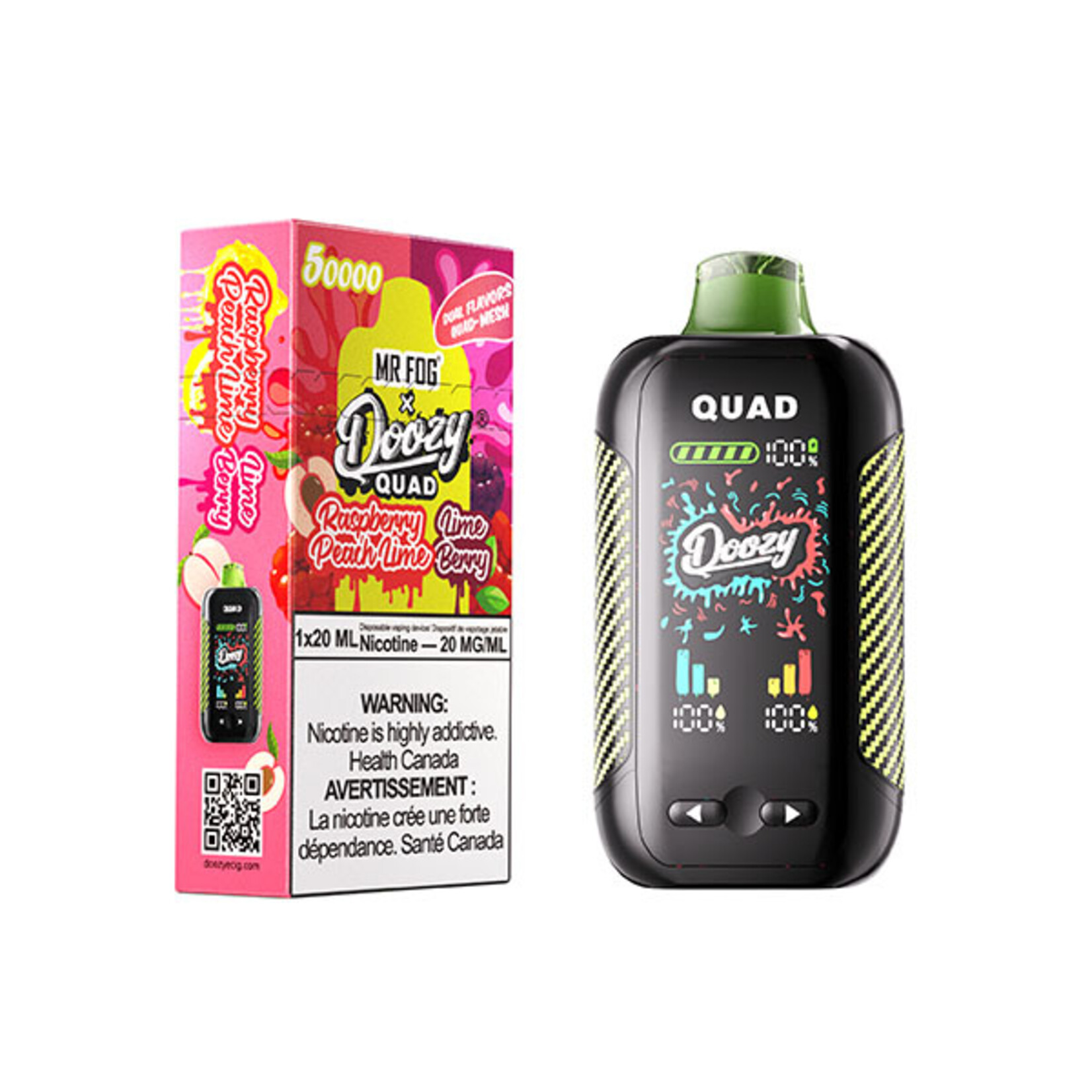DOOZY QUAD Raspberry Peach Lime & Lime Berry blends bright citrus with mellow and tart berry notes in a unique dual profile. The lime’s crisp edge adds spark, while the berry or peach pairing softens the delivery. Whether your session leans more toward tangy or smooth, the balance between these duos creates a refreshing lift that keeps the taste lively and full of motion.